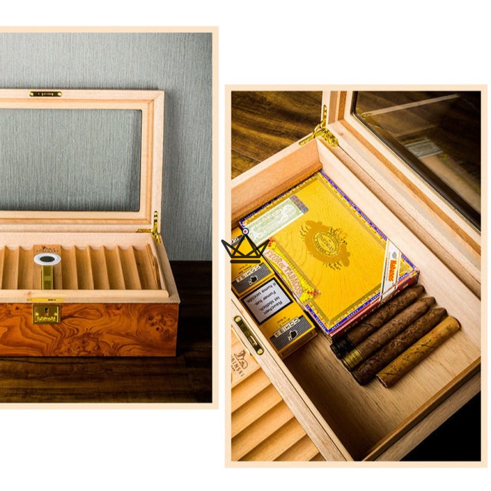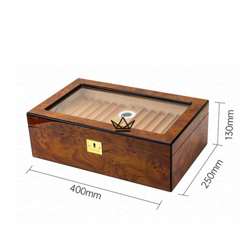 Les dimensions de la cave à cigares sont de 40 x 25 x 13 cm, offrant un espace généreux pour ranger vos cigares tout en les gardant organisés et facilement accessibles.