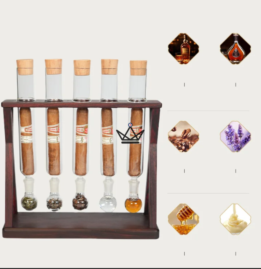 Der elegante Holzsockel , inspiriert von lateinischen Kreuzen, beherbergt fünf Borosilikatglasröhrchen mit Zedernholzstopfen. Jedes Röhrchen enthält ein diskretes, aber effektives Thermometer und Hygrometer . In die einzelnen Fächer können Sie flüssige (Whisky, Brandy, Rum, Honig usw.) oder trockene Aromen (Kaffeebohnen, Lavendel, Zitronenschalen usw.) einfüllen, um Ihren Zigarren subtil einzigartige Geschmacksnoten zu verleihen.