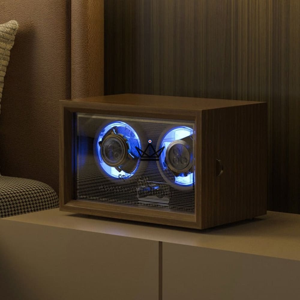 • Deaktivierbare LED-Beleuchtung (außer Solo) : Ein blau leuchtender Heiligenschein umgibt Ihre Uhren, wertet sie auf und verleiht Ihrer Sammlung gleichzeitig einen Hauch von Modernität.