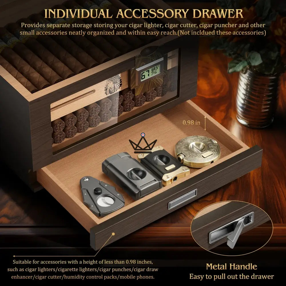 Mit seiner edlen Holzkonstruktion und dem Glasdeckel vereint dieser Humidor hochwertige Ästhetik mit optimaler Sichtbarkeit Ihrer Zigarrensammlung. Das Hauptfach bietet Platz für bis zu 80 Zigarren , verteilt auf ein großzügiges unteres Fach und eine herausnehmbare obere Ablage mit optimierten Belüftungsschlitzen.