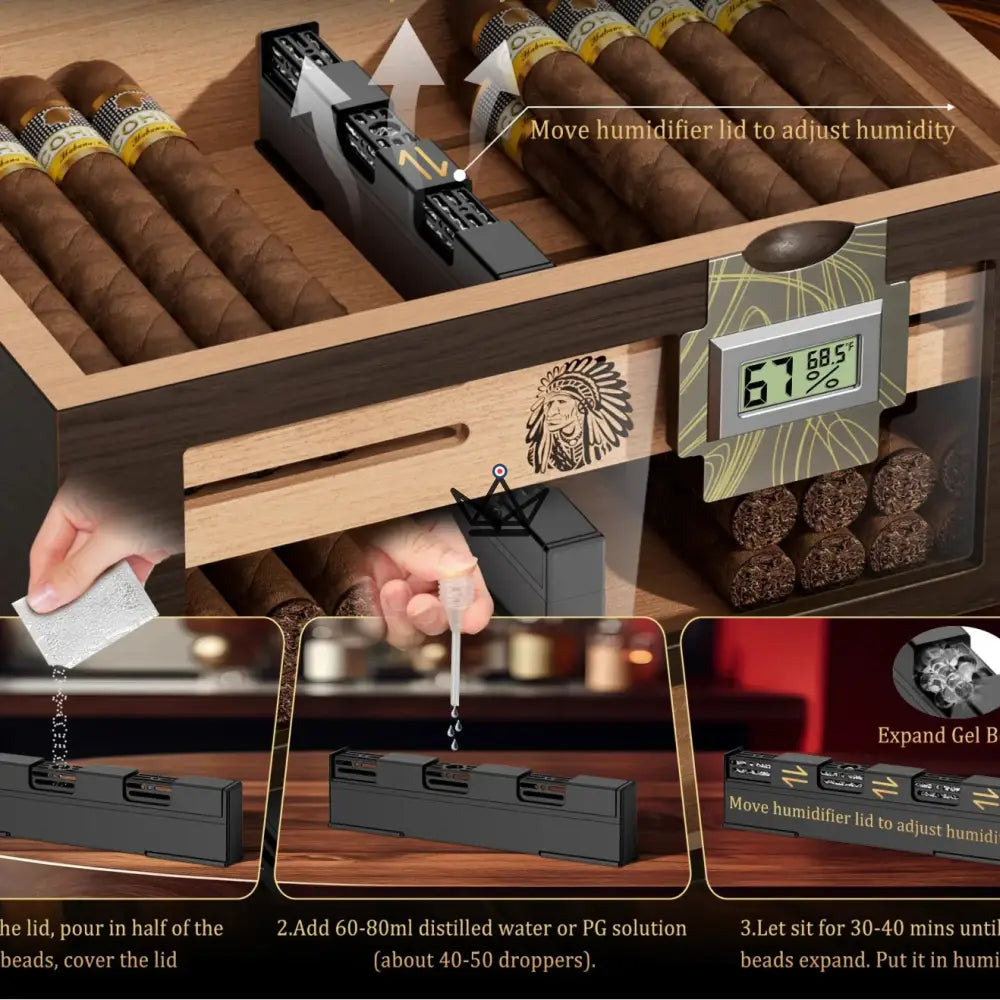 Zwei digitale Hygrometer, eines an der Vorderseite und eines auf dem Dach, gewährleisten hochpräzise Feuchtigkeitsmessungen, während zwei verstellbare Gel-Befeuchter eine Feinabstimmung des Befeuchtungsgrades ermöglichen. Das hydrophile Perlensystem garantiert eine langsame und gleichmäßige Feuchtigkeitsverteilung – ideal, um das volle Aroma Ihrer Zigarren zu bewahren.