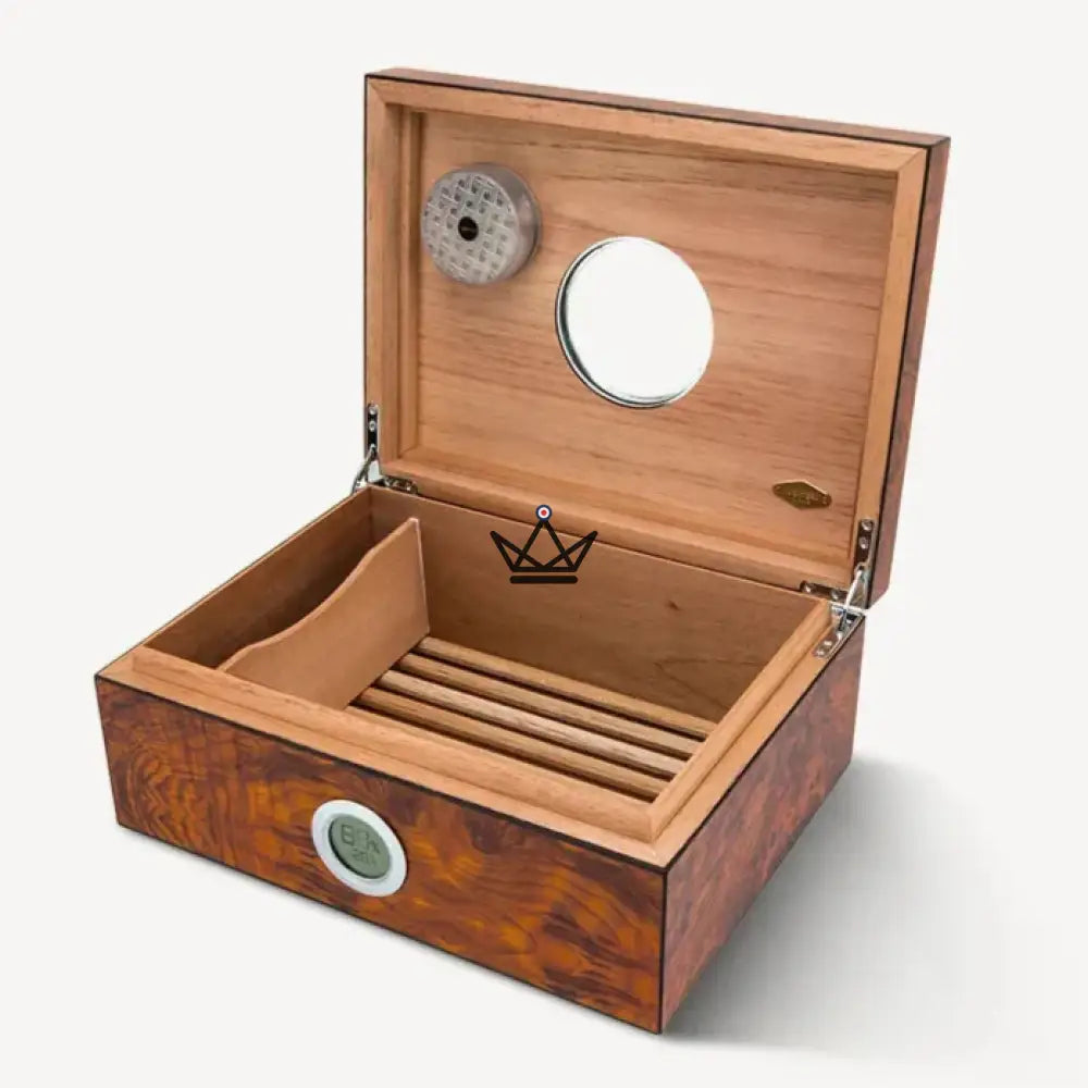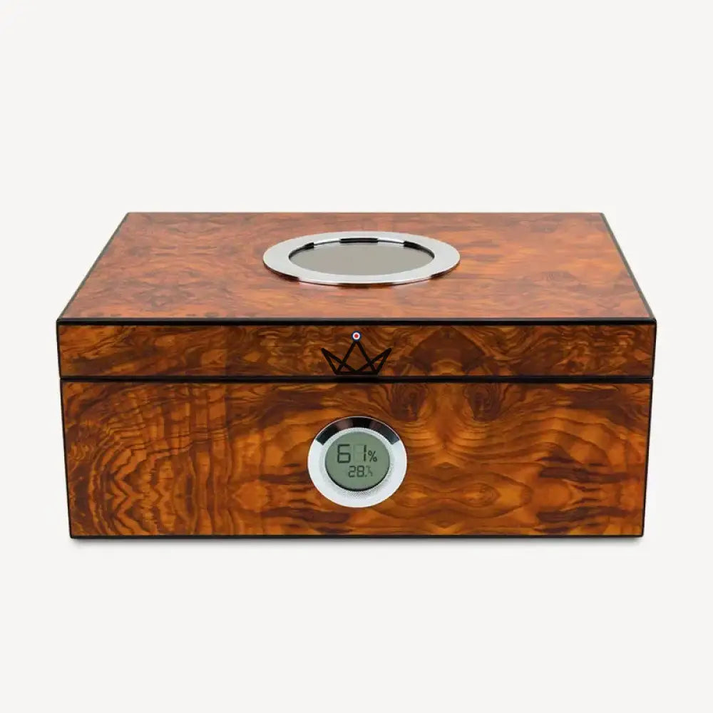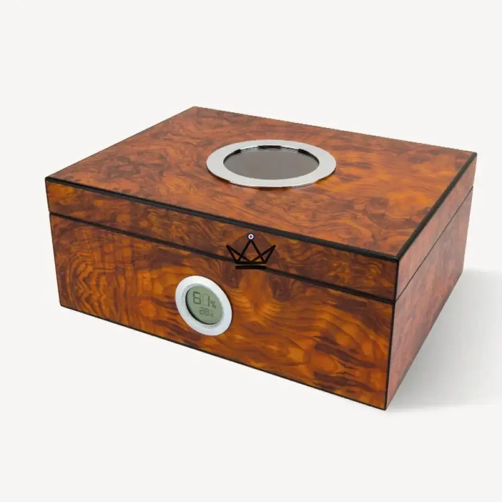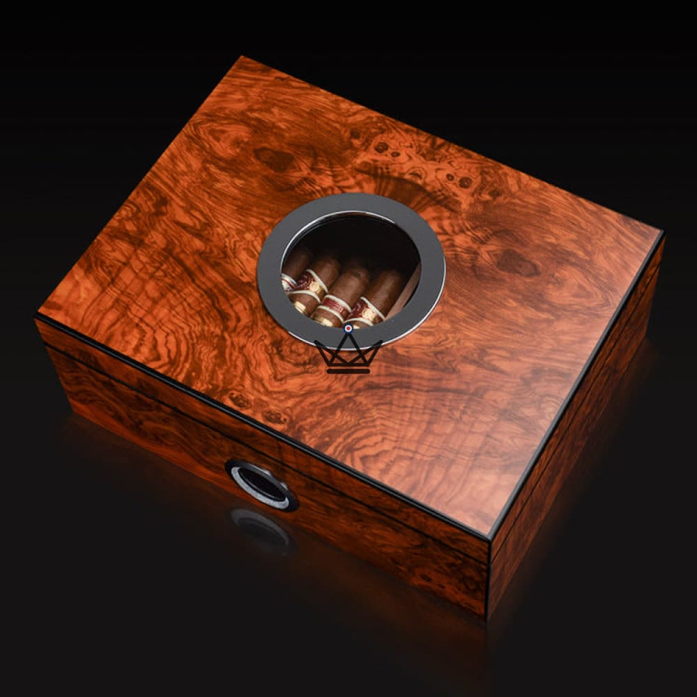 Its understated and elegant design, enhanced by a burl-effect wood veneer, is distinguished by a unique detail: a circular porthole on the lid, which allows you to view your collection without opening the box. You can thus monitor your Cohiba , Montecristo , Romeo y Julieta , Partagás or even Hoyo de Monterrey without compromising their preservation.