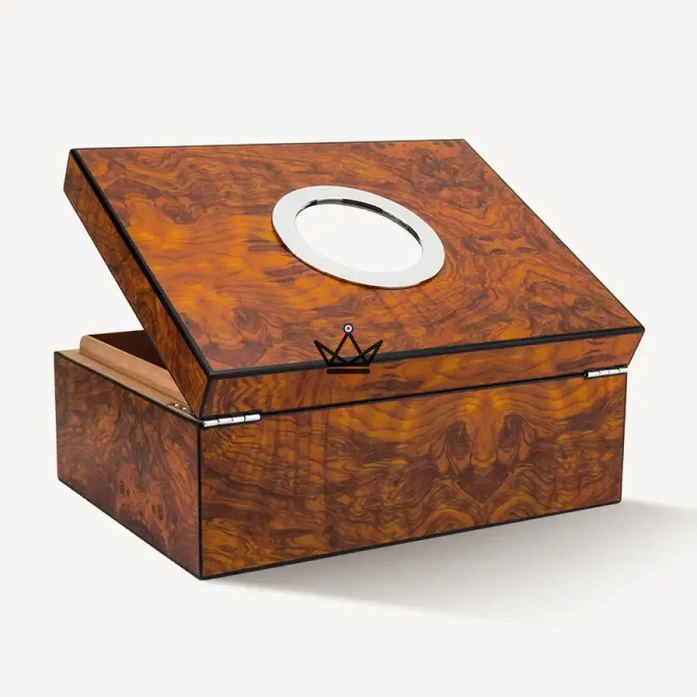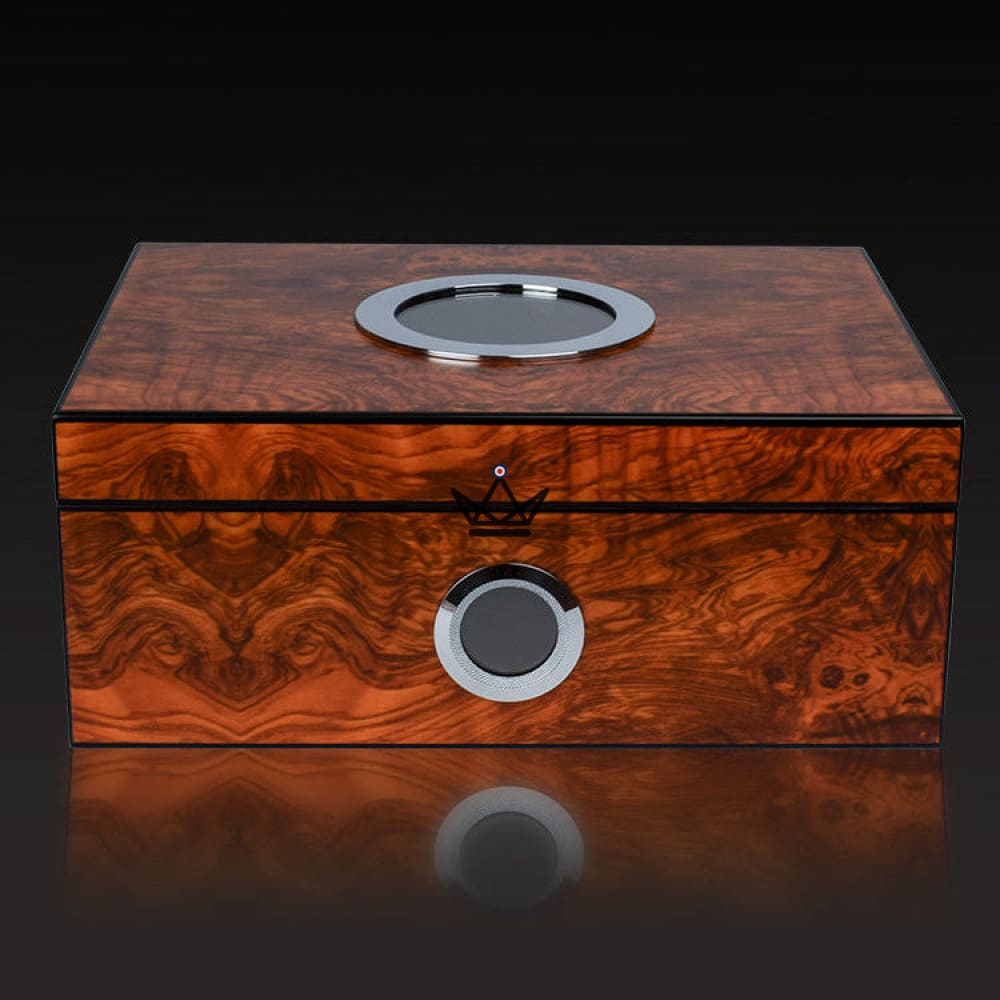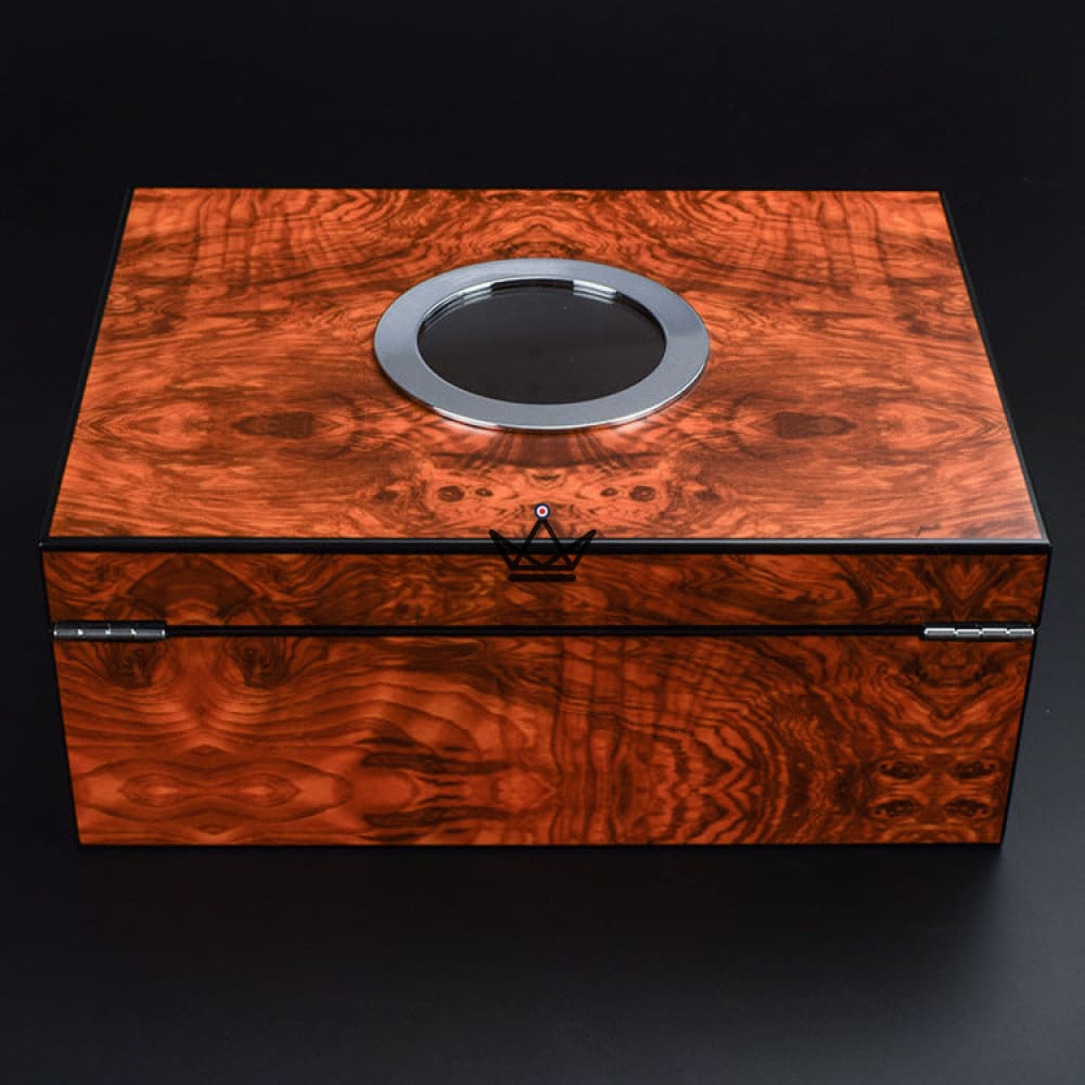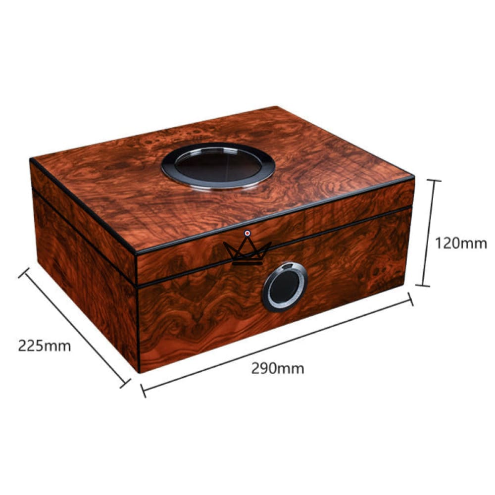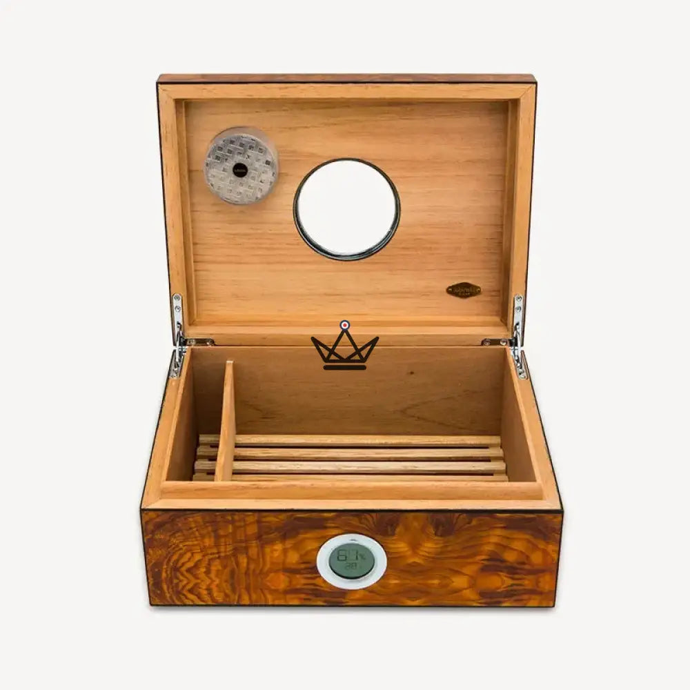 Its understated and elegant design, enhanced by a burl-effect wood veneer, is distinguished by a unique detail: a circular porthole on the lid, which allows you to view your collection without opening the box. You can thus monitor your Cohiba , Montecristo , Romeo y Julieta , Partagás or even Hoyo de Monterrey without compromising their preservation.
