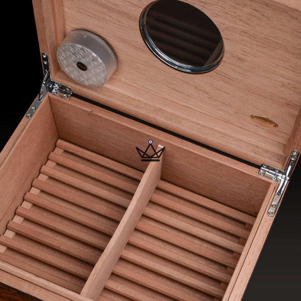 With its dimensions of 29 x 22.5 x 12 cm , the humidor can accommodate approximately 50 cigars (Churchill, Robusto, Toro, etc.). The interior is made of natural Spanish cedar , known for its antibacterial properties, its woody scent and its ability to stabilize humidity.