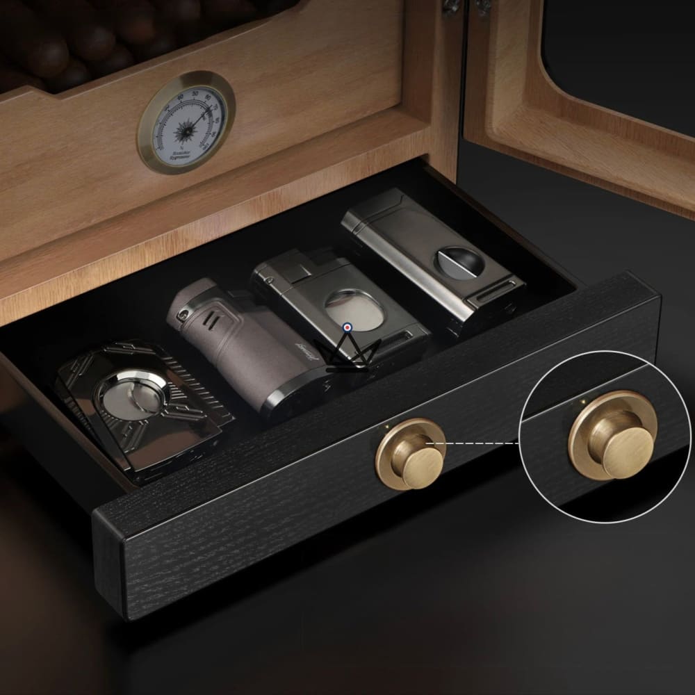 - A lower drawer dedicated to accessories , such as lighters , cigar cutters , long matches , or even your preparation tools, so you have everything at hand for a perfect tasting experience.