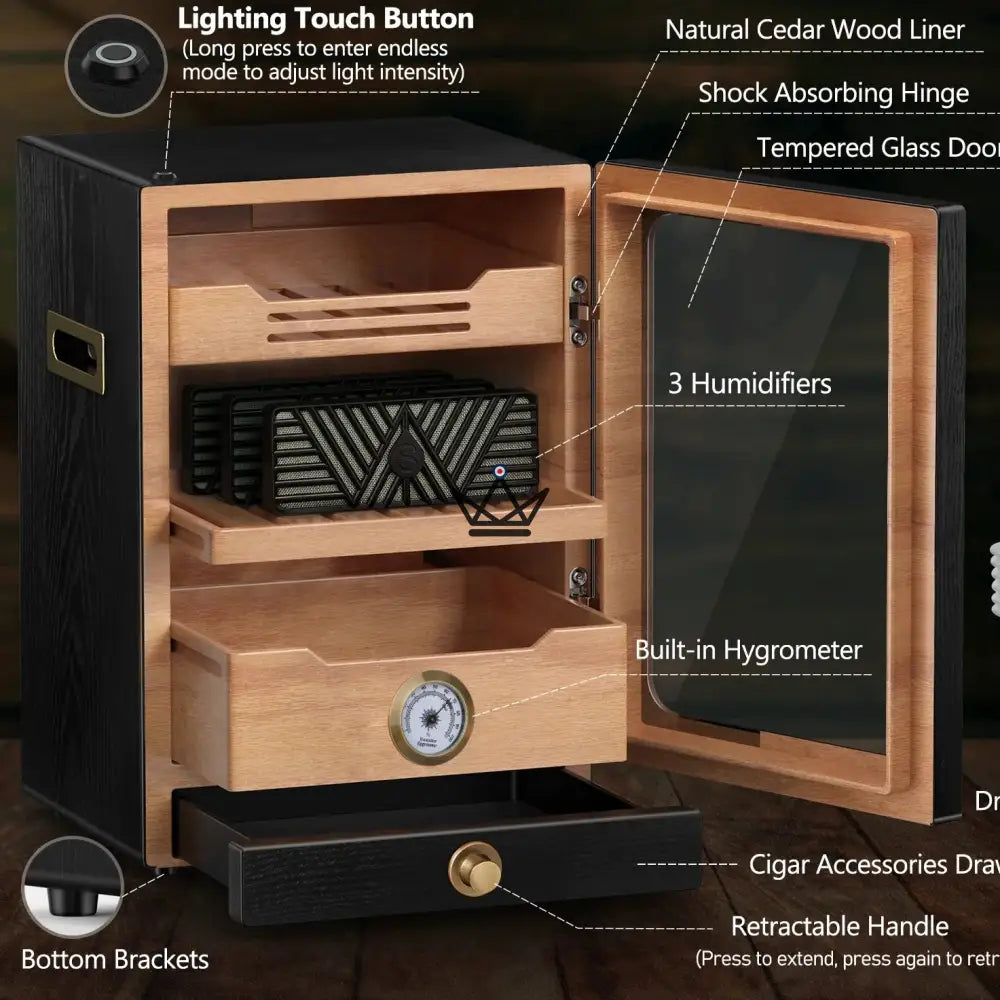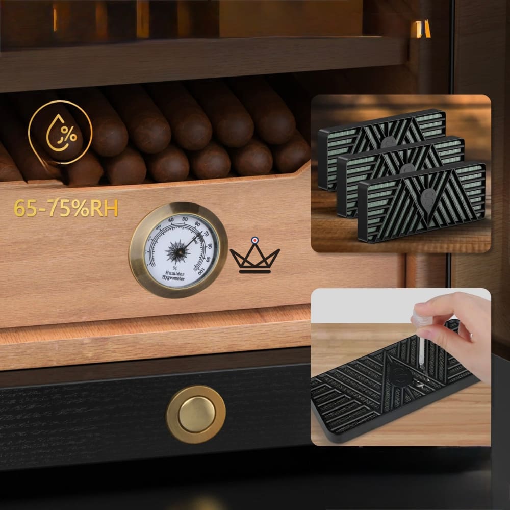 - Equipped with three sophisticated humidifiers , this humidor maintains a stable humidity level between 65% and 75% , essential for the long-term preservation of cigars.