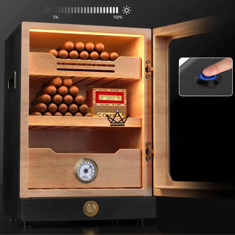 Available in two sumptuous finishes: Walnut Wood and Black Ebony , this humidor combines refined design with cutting-edge technology, ensuring the perfect preservation of your premium cigars such as Cohiba , Arturo Fuente , Montecristo , Partagas and many others.