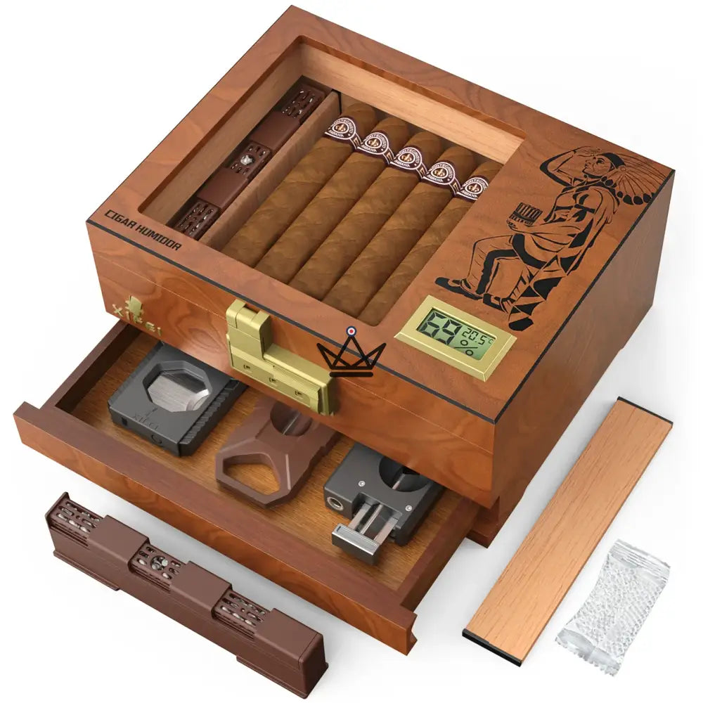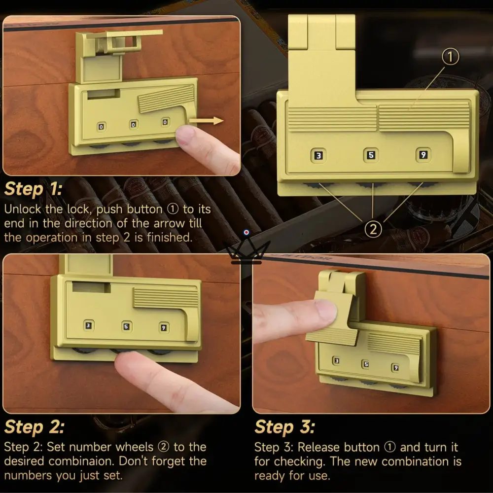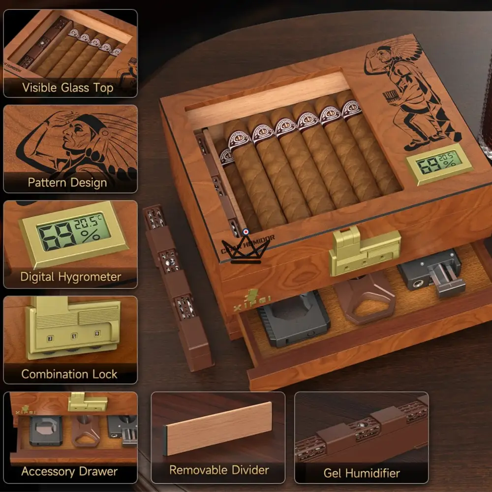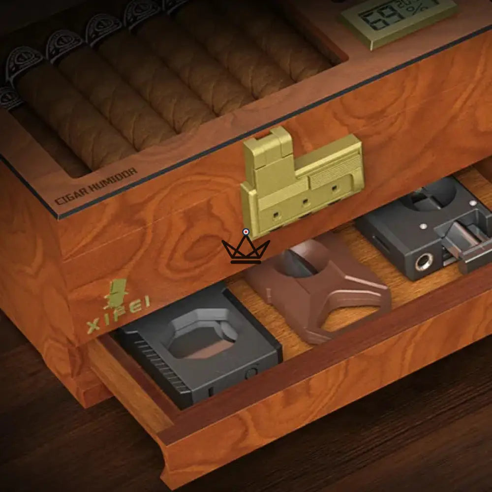 Its signature feature? A built-in combination lock, ideal for discerning collectors and enthusiasts keen to protect their cigars from unauthorized tampering. The lower drawer provides discreet storage for accessories, while maintaining a sleek, clean design.